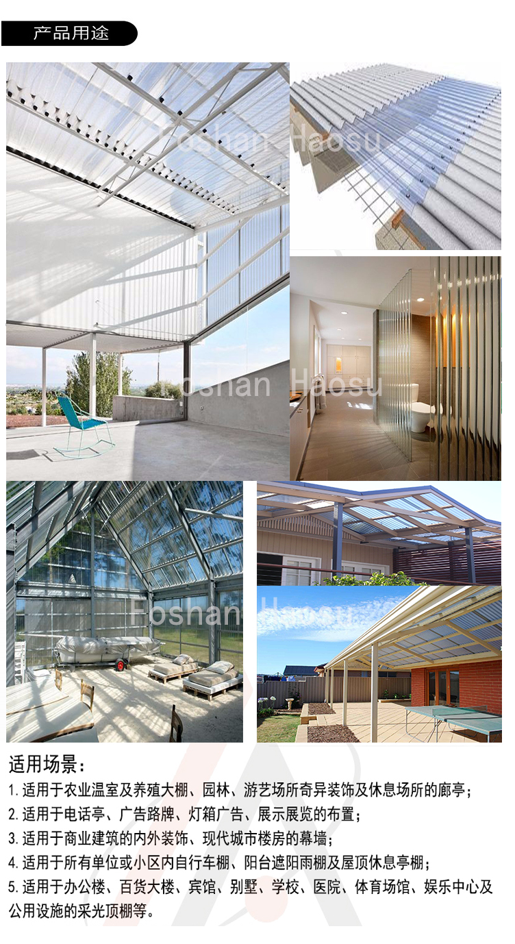 高速公路及城市高架路隔音屏障; 農(nóng)業(yè)溫室及養(yǎng)殖大棚; 現(xiàn)代生態(tài)餐廳頂棚; 所有單位或小區(qū)內(nèi)自行車棚、陽臺遮陽雨棚及屋頂休息亭棚; 辦公樓、百貨大樓、賓館、別墅、學(xué)校、醫(yī)院、體育場館、娛樂中心及公用設(shè)施的采光頂棚等 |